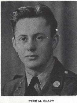 Fred M. Beaty Entered Service: February 14, 1941 Branch of Service: Infantry Trained at Camp Claiborne, Louisiana, Fort Dix, New Jersey. Overseas: April 1942 Theatre of Operations: European. Medals Earned: Infantry Badge, Purple Heart. Returned to U.S.: September 1944. Discharged: Camp Carson, Colorado, March 10, 1945. Rank: Staff Sergeant Total Months in Service: Forty-nine.