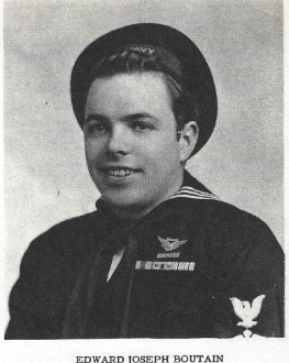 Edward Joseph Boutain Entered Service: August 31, 1942. Branch of Service: Navy Trained at Great Lakes, Norman, Oklahoma, Sand Point, Seattle, Washington, Jacksonville, Florida. Overseas: April 21, 1943. Theatre of Operation: Asiatic-Pacific. Engagements: Attu, new Guinea, Philippines. Returned to U.S.: April 8, 1946 Discharged: April 13, 1946, Wold Chamberlain, Minnesota. Rank: Aviation Chief Ordnance. Total Months in Service: Forty-four