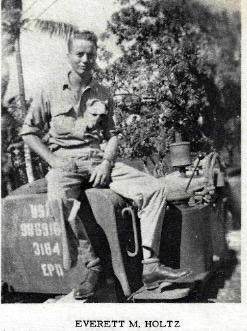 Everett M. Holtz Entered Service: September 12, 1944 Branch of Service: Engineers Trained at Camp Claiborne, Louisiana from September 22, 1944 until April 30, 1945. Fort Lewis, Washington from May 19, 1945 until August 24, 1945. Overseas: August 24, 1945 Theatre of Operation: Asiatic-Pacific Medals Earned: Victory, Asiatic-Pacific, Good Conduct Medal. Returned to U.S.: August 19, 1946 Discharged: August 24, 1946 at Fort Lewis, Washington Rank: Staff Sergeant Total Months in Service: Twenty-three.