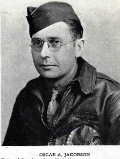 Oscar A. Jacobson Entered Service: June 12, 1942. Branch of Service: Army Air Force. Trained at Jefferson Barracks, Missouri; Atlantic City, New Jersey; Tucson, Arizona; Wendover Field, Utah; Pueblo, Colorado. Overseas: February 15, 1943 Theatre of Operation: China, Burma, India. Medals Earned: Good Conduct Medal, Distinquished Unit Badge, One Oak Leaf Clover. Returned to U.S.: October 15, 1945 Discharged: October 24, 1945, at Camp McCoy, Wisconsin. Rank: Sergeant Total Months in Service: Forty.