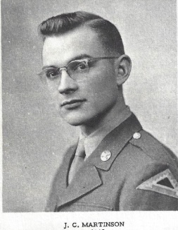 J. C. Martinson Entered Service: June 22, 1945 Branch of Service: Army - Quartermaster Corp. Trained at Camp Lee, Virginia from July 1, 1945 to December 9, 1946; Fort Jackson, South Carolina from December 9, 1946 to February 16, 1947. Discharged: February 16, 1947 at Fort Jackson, South Carolina. Rank: Corporal Total Months in Service: Nineteen.
