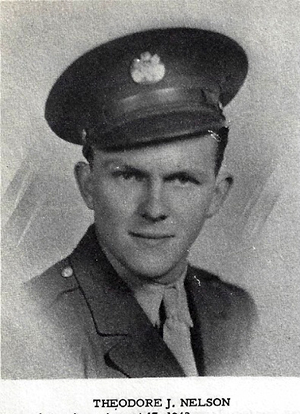 Theodore J. Nelson Entered Service: August 17, 1942. Branch of Service: Signal Corp Trained at Byrd Field, Richmond, Virginia; Drew Field, Tampa, Florida; Midland Radio School, Kansas City, Missouri; Camp Pinedale, Fresno, California. Overseas: August 17, 1943. Theatre of Operation: European. Engagements: Rome-Arno, Po. Valley. Medals Earned: Good Conduct, European Theatre, Victory. Returned to U.S.: October 16, 1945. Discharged: October 23, 1945, Camp McCoy, Wisconsin. Rank: Staff Sergeant Total Months in Service: Thirty-eight.