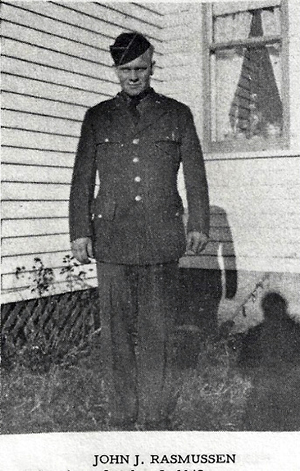 John J. Rasmussen Entered Service: October 2, 1942. Branch of Service: Army. Trained at Camp Adair, Oregon; Fort Lewis, Washington; Bend, Oregon; Camp White, Oregon; San Luis Obispo, California; Camp Calhoun, Camp Beale, Oregon, Camp Stoneman, California. Overseas: July 28, 1944. Theatre of Operation: South Pacific. Engagements: Leyte, Okinawa. Medals Earned: Good Conduct Medal. Returned to U.S.: January 11, 1946. Discharged: January 19, 1946, Camp McCoy, Wisconsin. Rank: Private First Class. Total Months in Service: Forty months, and seventeen days.
