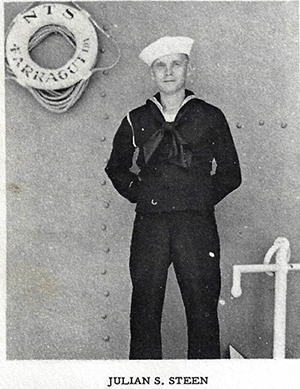 Julian S. Steen Entered Service: July 22, 1943. Branch of Service: Navy. Trained at Farragut, Idaho; Williamsburg, Virginia at College of William and Mary. Overseas: February, 1944. Theatre of Operation: Caribbean. Returned to U.S.: September, 1944. Discharged: November 15, 1945, Shelton, Virginia. Rank: S.P. (W) 2/c Total Months in Service: Twenty-eight.