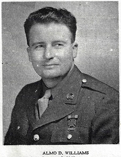 Almo D. Williams Entered Service: January 8, 1942. Branch of Service: Field Artillery Trained at Camp Roberts, California. Joined "90th Infantry Division" Camp Barkley, Texas. Service school at Fort Sill, Oklahoma. Lousiana and desert maneuvers Overseas: March 23, 1944 Theatre of Operation: European Engagements: Normandy, Northern France, Ardennes, Rhineland, Central Europe. Medals Earned: Good Conduct Medal, Bronze Star, Bronze Arrowhead Victory. Returned to U.S.: November 11, 1945 Discharged: November 26, 1945, at Fort Bliss, Texas. Rank: Staff Sergeant Total Months in Service: Forty-seven.