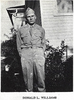 Donald L. Williams Entered Service: January 29. 1946 Branch of Service: Service Forces. Trained at Fort Bliss, Texas; Vint Hill Farm School, Warrenton, Virginia; Fort Snelling, Minnesota; Camp McCoy, Wisconsin. Discharged: Camp McCoy, Wisconsin, May 15, 1947 Rank: Private First Class Total Months in Service: Fifteen and one-half.